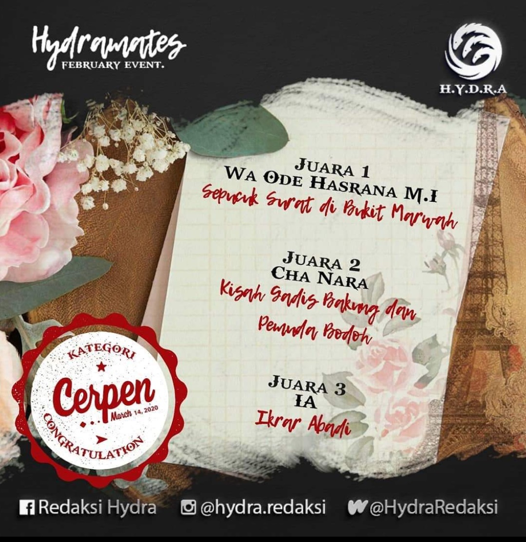 3. Juara 1 Lomba Cerpen Nasional oleh Hydra Publisher
